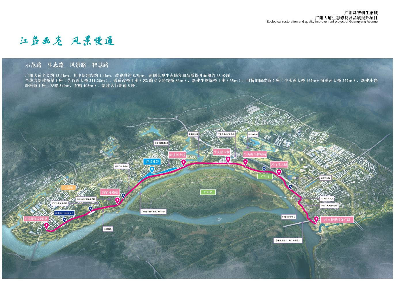 广阳大道项目西起郭家沱长江大桥桥下,东至东港片区华港路,北临广阳湾,与广阳岛隔江相望。项目道路全长13km,其中新建段长4.26km(包括新建桥梁一座),包括生态修复、道路、桥梁、边坡、雨水、污水、照明、电力、通讯、景观等建设内容。改建段长8.74km(由现状24m提升为规划宽度32m),包括生态修复、道路加宽、路面改造、桥梁加固、重建雨污水管道、新建照明电力通讯设施、边坡品质提升等建设内容。两侧生态修复和品质提升面积1108亩。